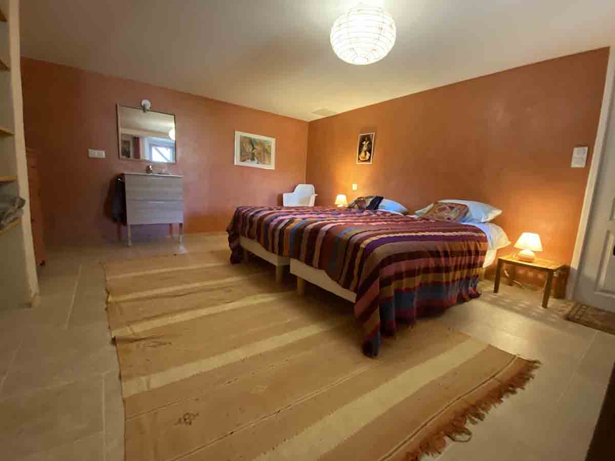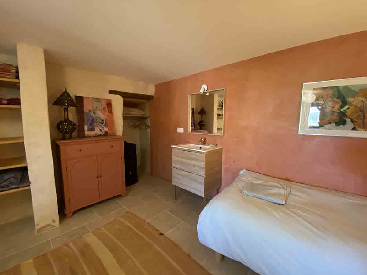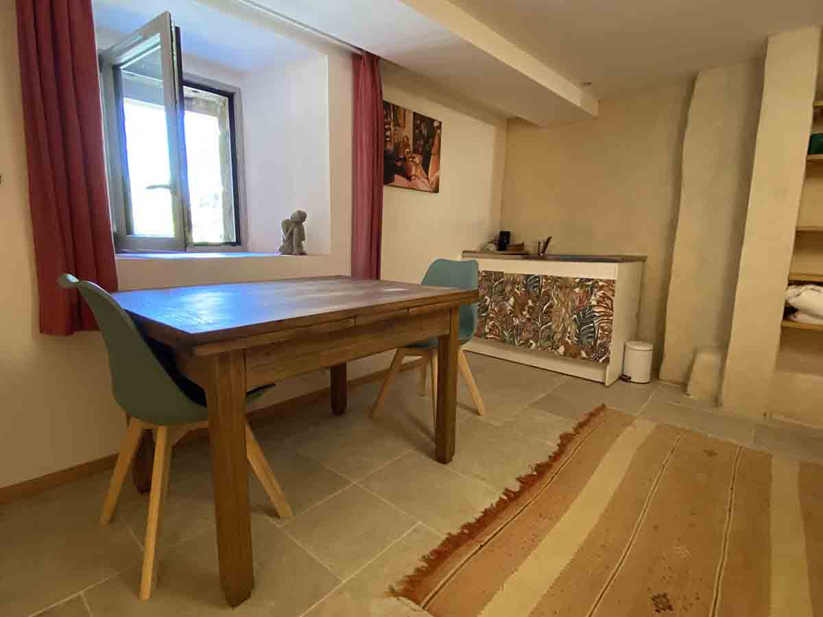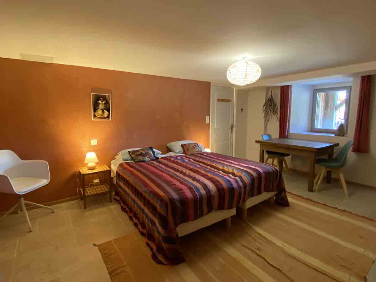 Grande chambre au rez-de-jardin. Accès par l’extérieur et la buanderie. Lavabo et petite cuisine. Sdb partagée.